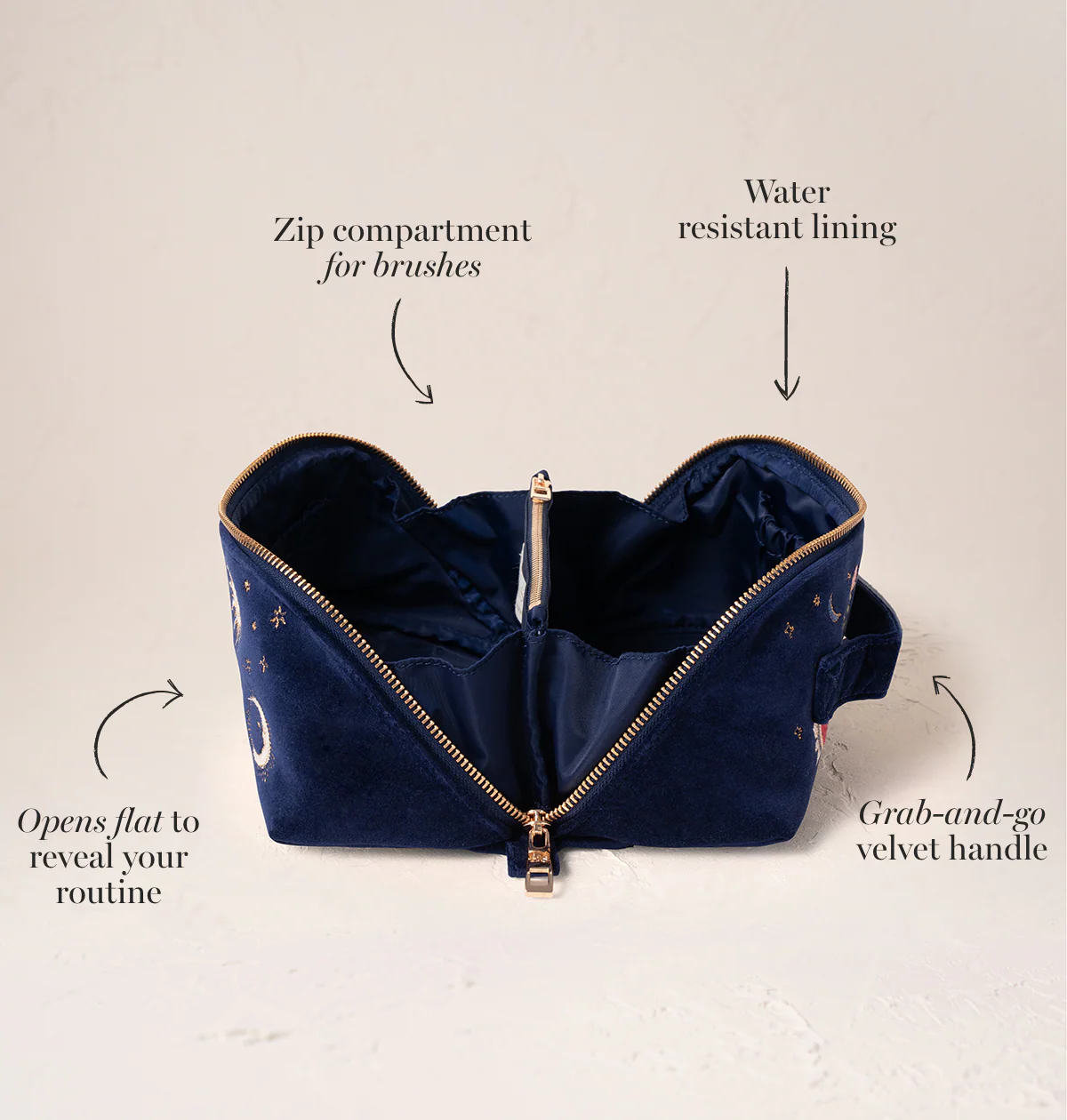 Say goodbye to rummaging and loose lipsticks: this clever makeup bag lays flat on any surface to reveal your full routine, beautifully laid out. Twinkling with stars, moons and a radiant sun against midnight velvet, hold the magic of the night sky in your hands.