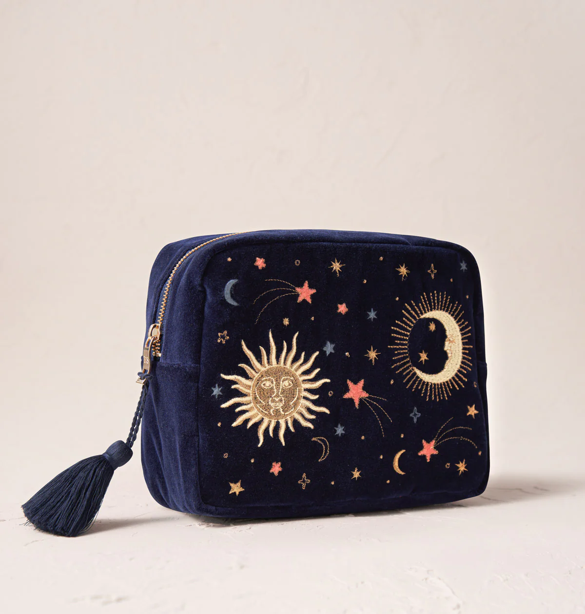 Be travel-ready at all times with a waterproof lining, zip tassel and inner pockets, perfect for organising your lotions and potions, home or away. Twinkling with stars, moons and a radiant sun against midnight velvet, hold the magic of the night sky in your hands.