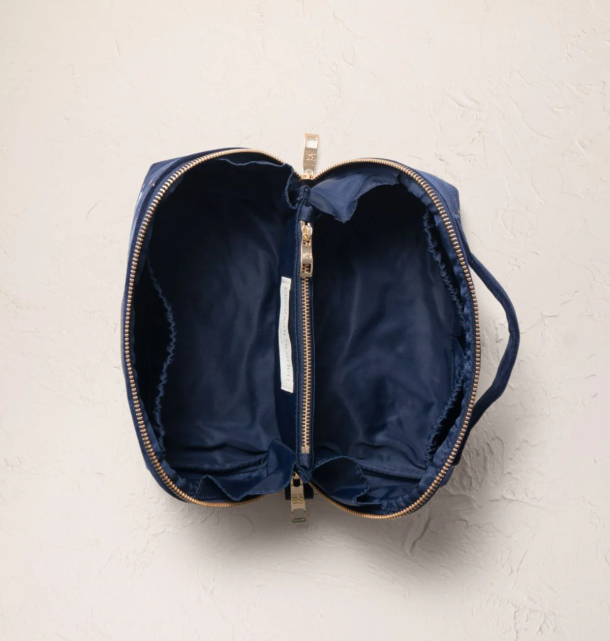 Say goodbye to rummaging and loose lipsticks: this clever makeup bag lays flat on any surface to reveal your full routine, beautifully laid out. Embroidered with a gentle family of whales gliding through a midnight velvet sea, threads of gold and silver shimmer with the ocean's magic in every detail.
