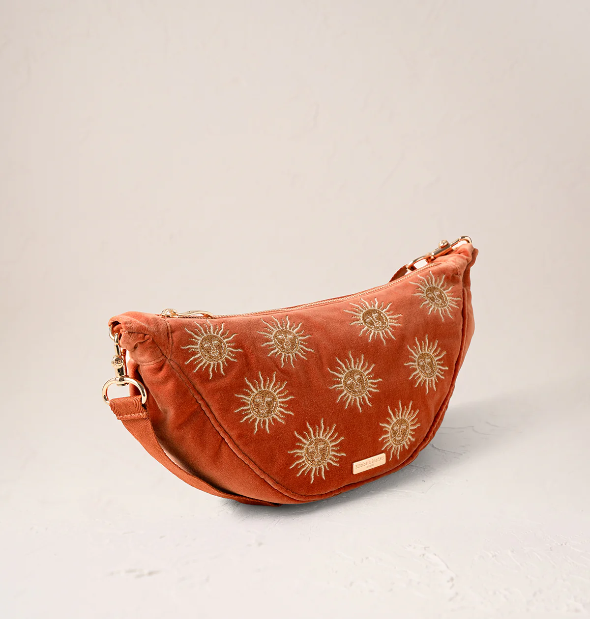 Designed for a life on-the-move, keep your daily must-haves close with an adjustable strap, zipped pockets and handy key clip - from city strolls to coffee catch-ups and beyond. Featuring Elizabeth's hand-drawn sun motif, embroidered in vanilla and gold threads with a human-like face that imagines our most powerful star as a gentle being radiating warmth and light.