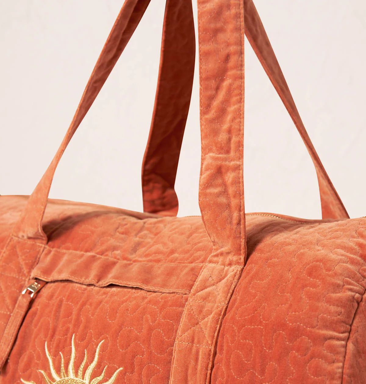 Our overnight bag features an adjustable strap, interior and exterior pockets, and room for all your essentials - designed to carry on repeat from gym to farmers market, day trips or weekend getaways. Featuring Elizabeth's hand-drawn sun motif, embroidered in vanilla and gold threads with a human-like face that imagines our most powerful star as a gentle being radiating warmth and light.